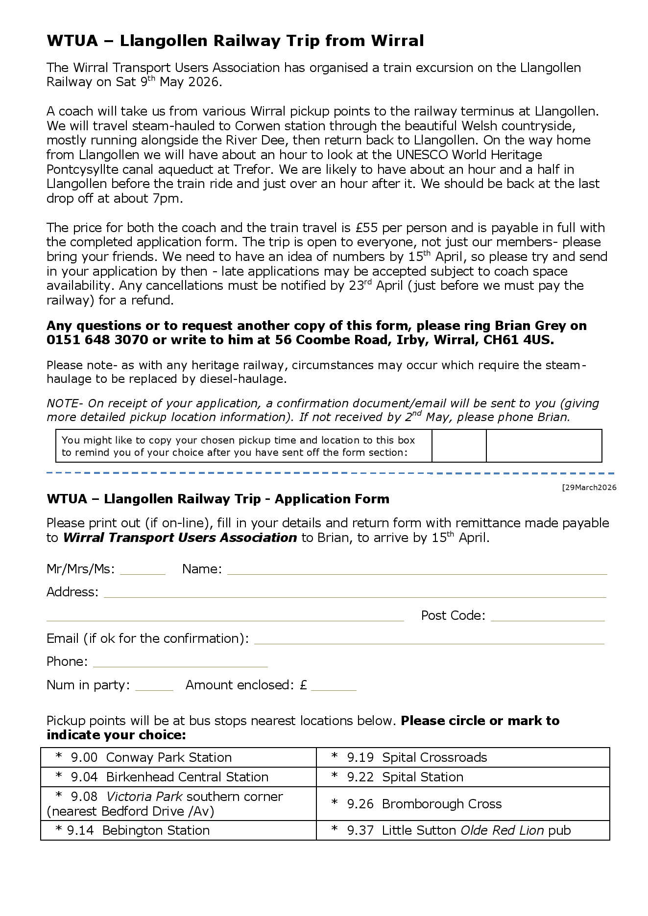 For further info on the trip and/or to request an Application Form, please email wirraltua@gmail.com, or contact Brian Grey-